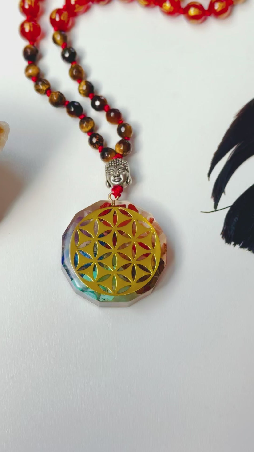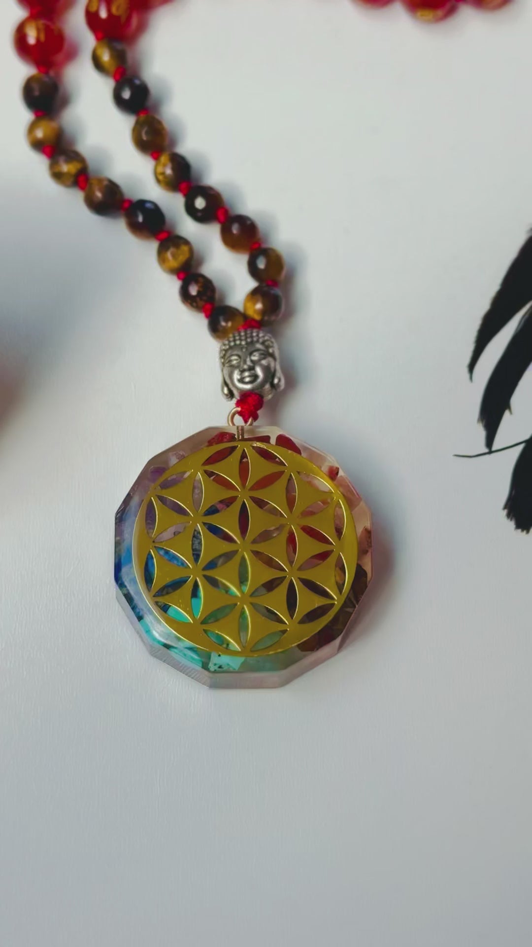 At the heart of this mala lies an Orgonite Flower of Life pendant.