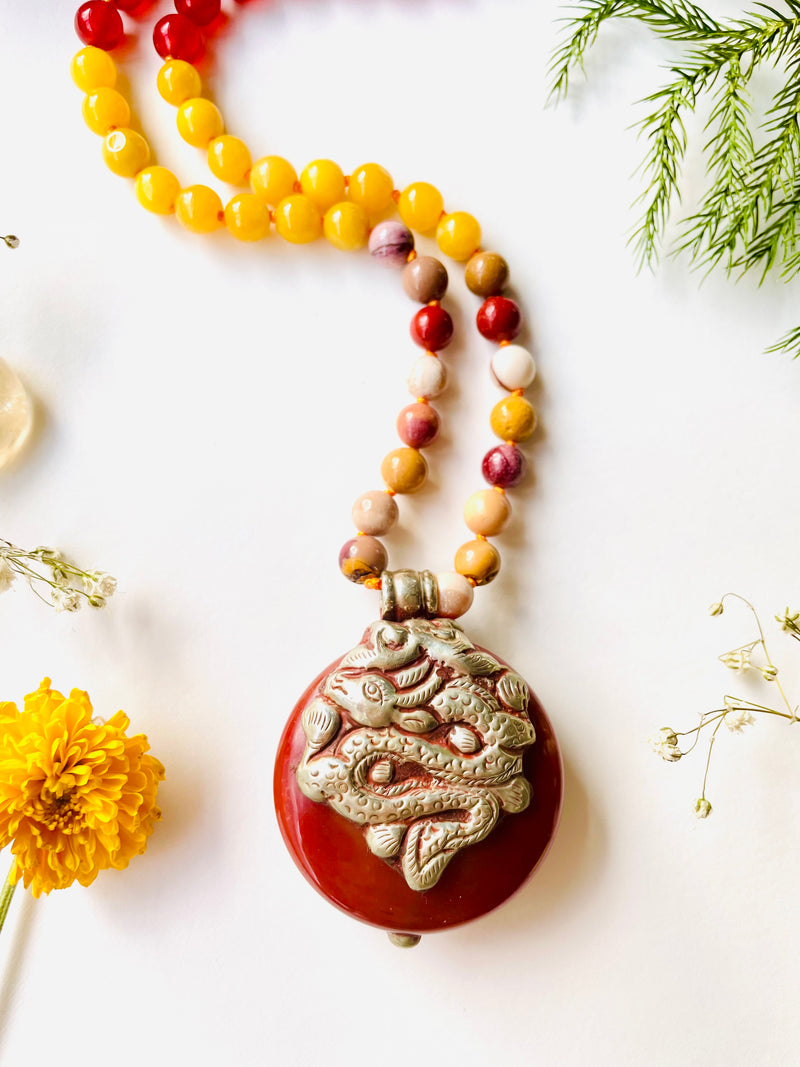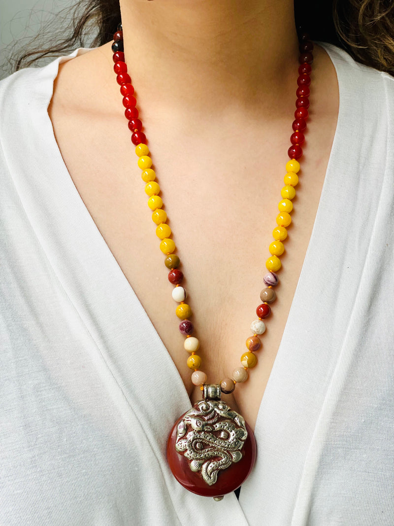 Wear the "Vitality" Necklace as a dynamic expression of your boundless energy. Let the grounded energy of Mookaite Jasper, the solar vitality of Yellow Quartz, the passionate energy of Carnelian, the grounding strength of Mahogany Obsidian, and the timeless beauty of the Vintage Brown Agate Pendant celebrate the enduring vitality within you. Elevate your style and embrace the beauty of your vibrant spirit with this carefully crafted necklace.