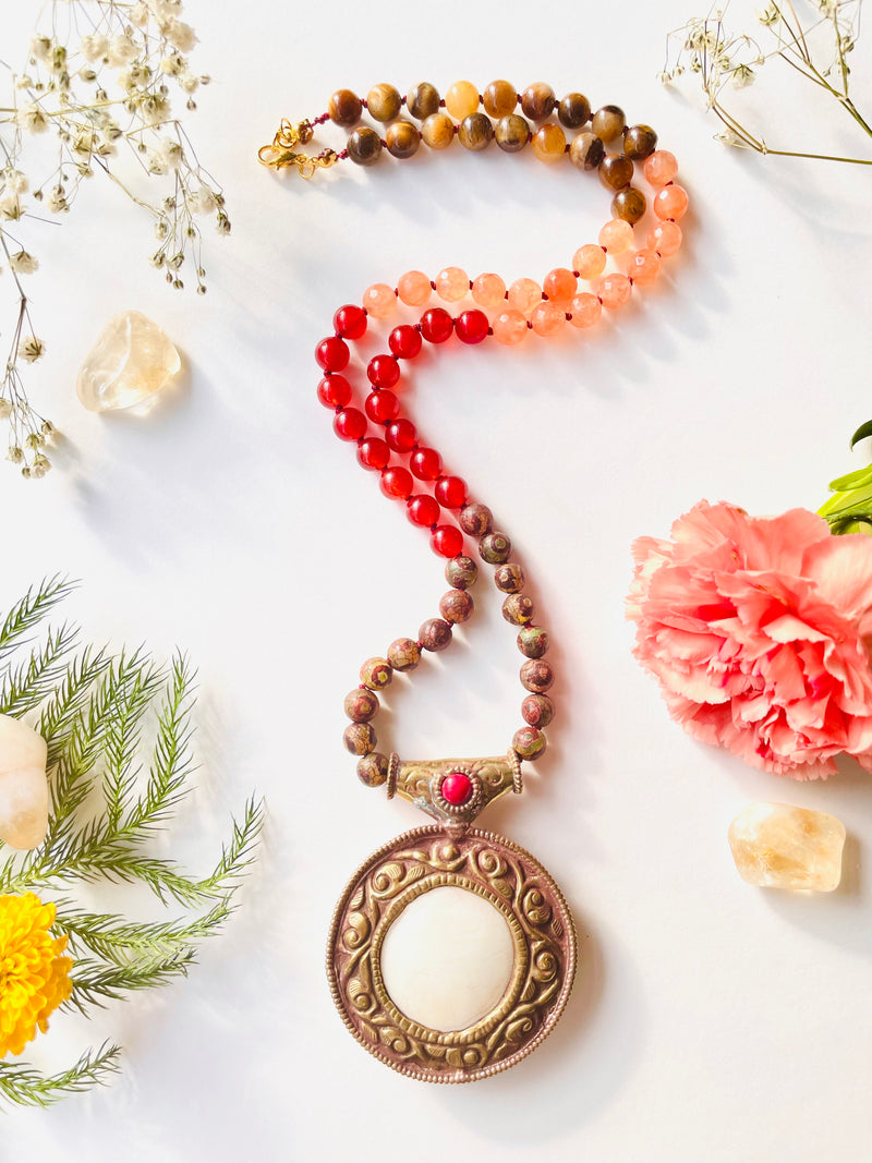 Ignite your inner drive and channel focused motivation with our "Focused & Motivated" Necklace, a carefully curated ensemble of energizing gemstones designed to enhance clarity, determination, and vitality. Featuring Tiger's Eye, Sunstone, Carnelian, Tibetan Agate, and adorned with a Vintage Brass Pendant, this necklace is more than a piece of jewelry; it's a wearable reminder to stay on the path of purpose and accomplishment.