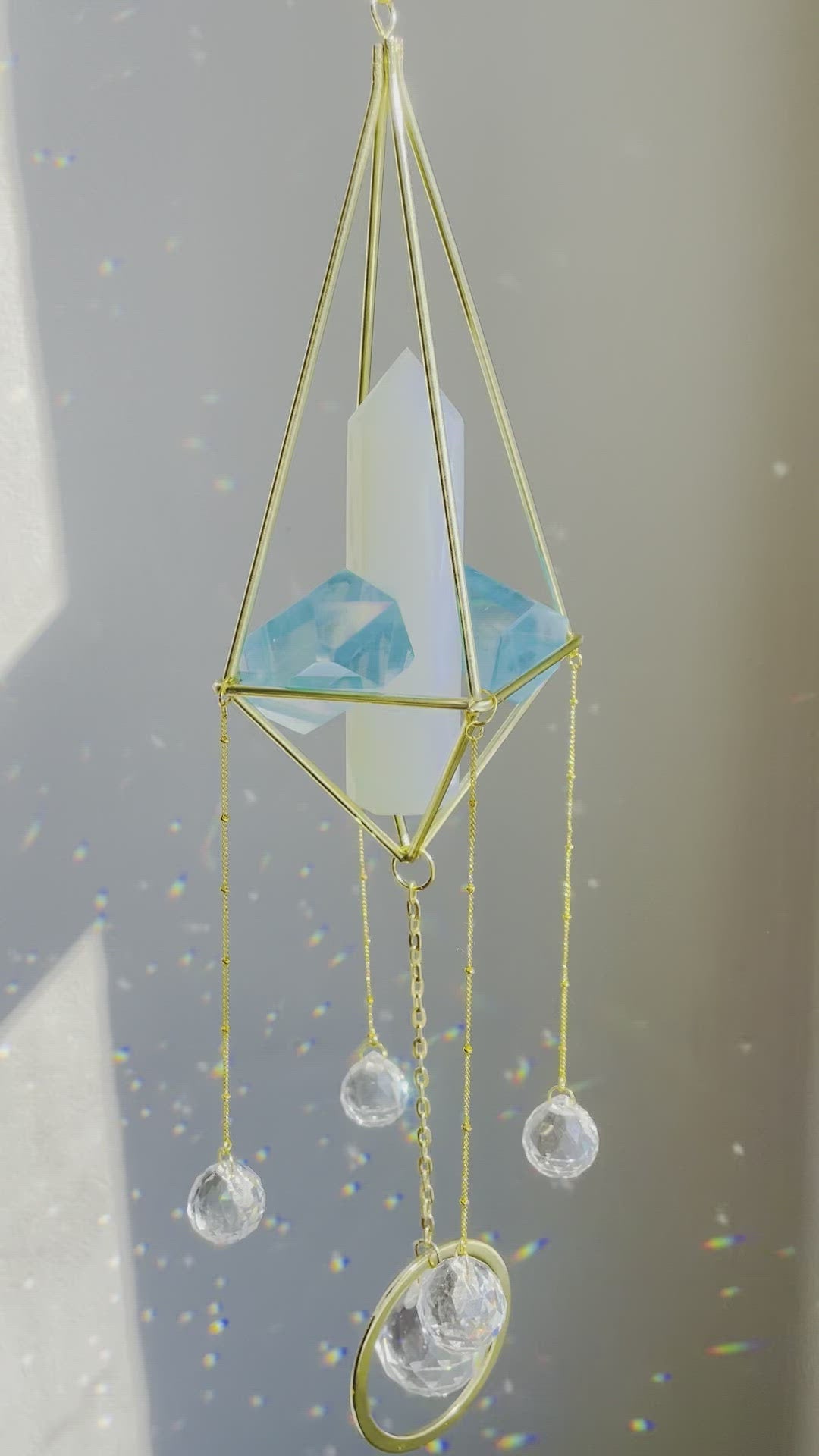 This High Vibrations Opal Tower Suncatcher features Opal tower and blue angel aura quartz mini towers with a new moon and topped with glass crystal prisms. Opal enhances cosmic consciousness and induces psychic and mystical visions. It stimulates originality and creativity. Helps to release anger and claim self worth, aiding in accessing and expressing one's true self.