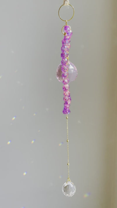 Bask in the beauty of dancing rainbows with our Lilac Pink Midi Crescent Suncatcher. Designed to catch the light just right, this enchanting piece transforms any space into a prism of wonder. When the sun's rays kiss its delicate crystals, mesmerizing rainbow reflections fill the room, creating a serene and magical atmosphere.