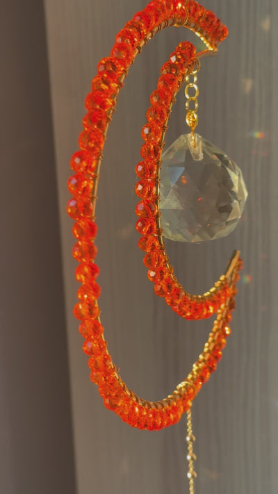 Invite warmth, color, and a touch of crystal magic into your home with our Maxi Crescent Orange Suncatcher. Designed to harness the power of light, this mooncatcher transforms any space into a glowing sanctuary of beauty and positivity.