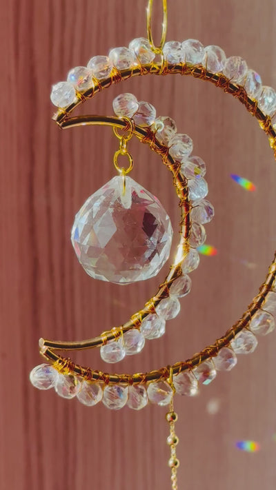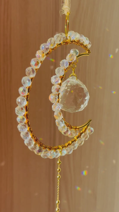 💫 Bring pure light and calm to your space with the Midi Crescent Clear Suncatcher – a delicate crescent moon wire-wrapped with soft clear Czech crystals, designed to soothe and uplift the spirit.