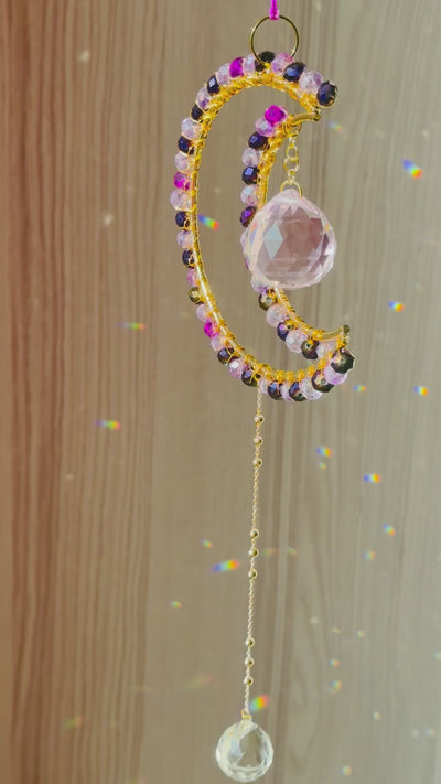 💎 Hand-wrapped with a mesmerizing mix of violet Czech crystals, this crystal suncatcher radiates mystical beauty and calming energy. Each bead glows with a unique shade of purple, from soft lavender to deep amethyst tones.