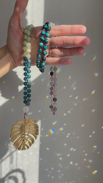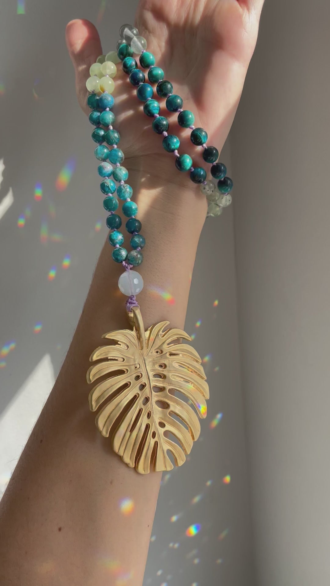 Step into your heart space with the Monstera Mala — a radiant, hand-beaded meditation necklace designed to open, balance, and nurture the Heart Chakra (Anahata).