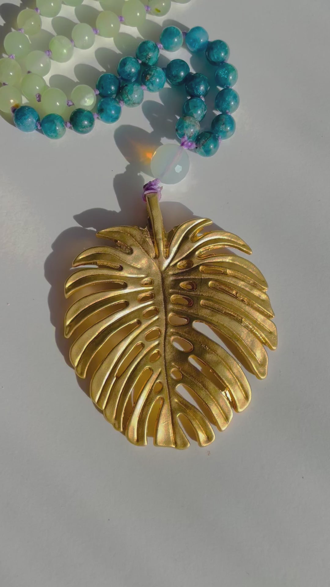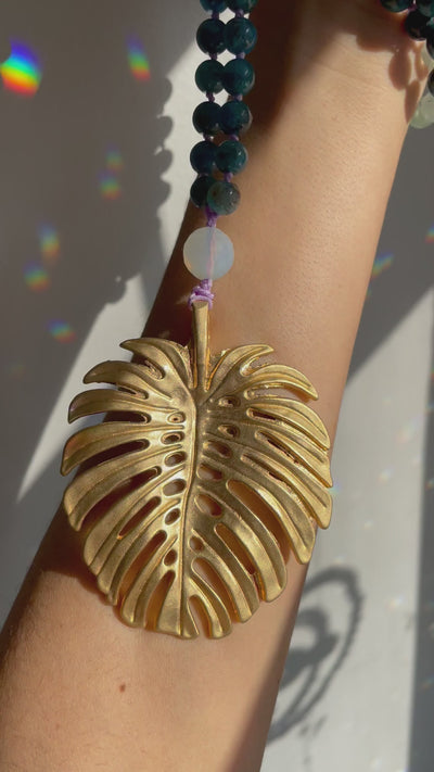 At its center hangs a gold-plated Monstera leaf pendant, symbolizing growth, vitality, and connection to nature’s infinite wisdom. The lustrous leaf captures the beauty of transformation — a reminder that healing begins when the heart opens.
