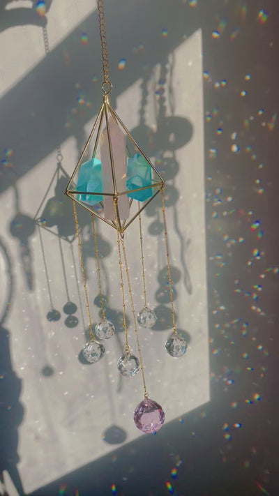 This Rose & Blue Quartz Tower Hexagonal Pyramid Suncatcher features Aura coated Rose Quartz tower and blue angel aura quartz mini towers topped with 7 glass crystal prisms hanging & creating rainbows.